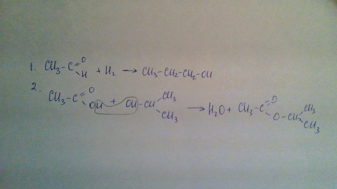 1. CH3-COH + H2 = CH3-CH2-OH (этиловый спирт)