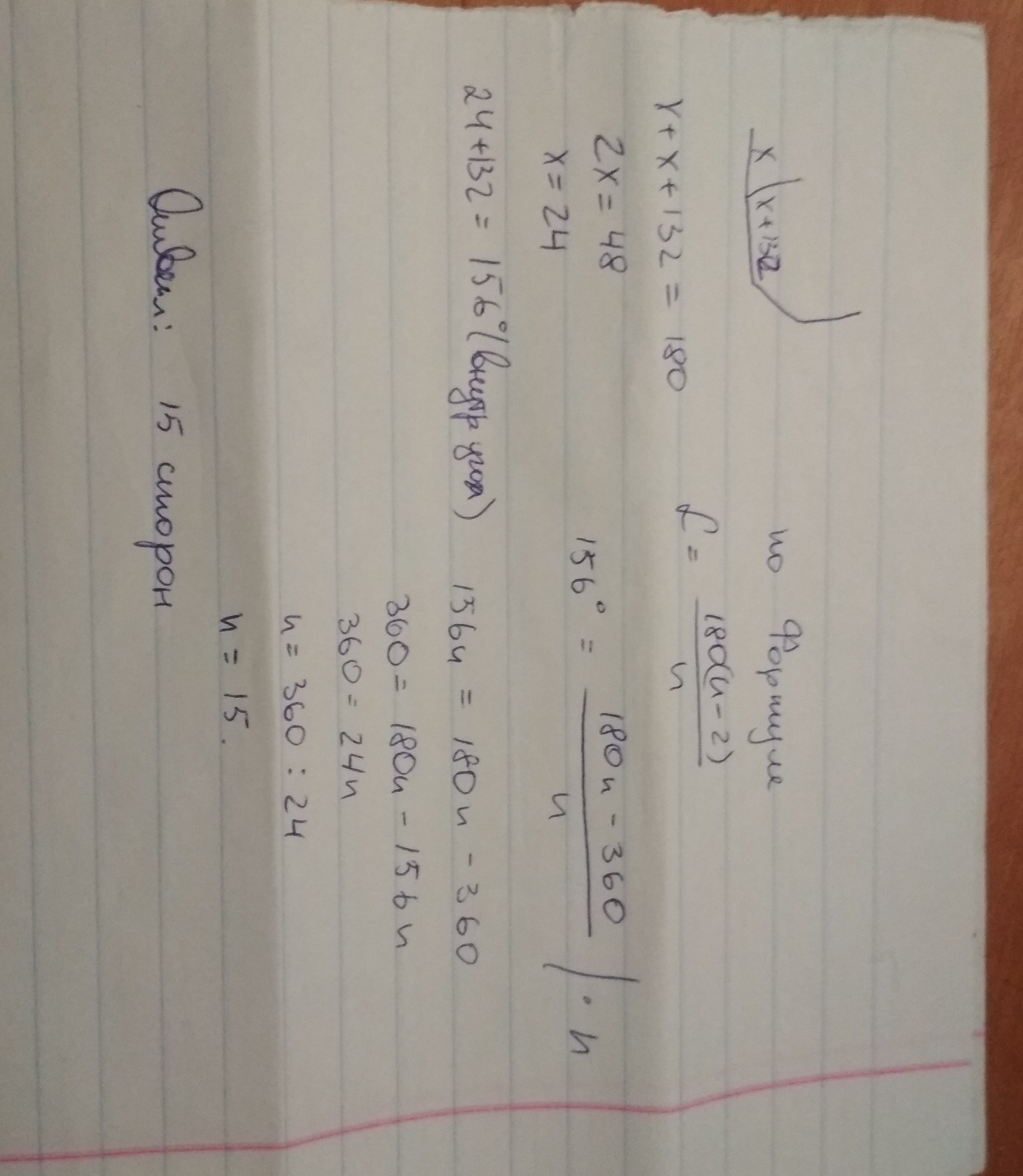 Внутрішній кут правильного многокутника на 132° більший за зовнішній.Скільки сторін має многокуьник