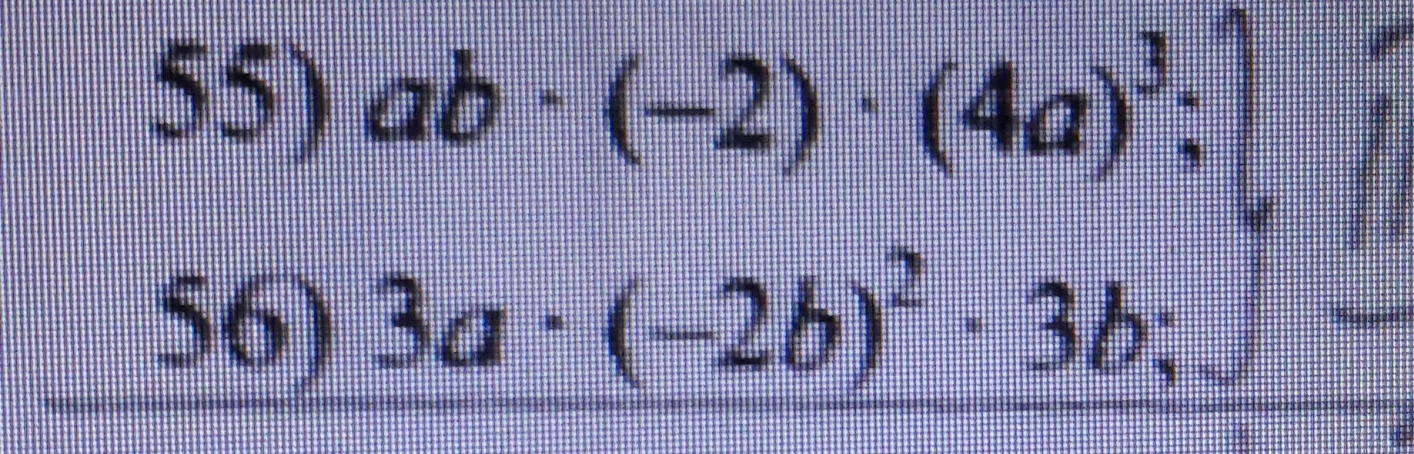55) ab * (-2) * (4a)^3 = -2 * ab * (4*4*4*a*a*a) = -2 * ab * 64 * a^3 = -2*64 * b * a^4 = -128 * b * a^4
