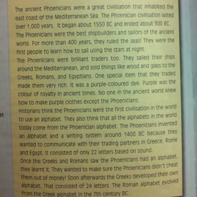 Древние финикийцы были великой цивилизацией, которая обитала на восточном побережье Средиземного моря. Финикийская цивилизация длилась более 1000 лет. Это началось около 1550 года до нашей эры и закончилось около 300 Bc. Финикийцы были лучшими судостроителями и матросами древнего мира. На протяжении более 400 лет они управляли морем. Они были первыми людьми, которые научились плыть по звездам ночью. Финикийцы тоже были блестящими торговцами. Они плавали на своих кораблях по Средиземному морю и продавали греки, римляне и египтяне предметы, такие как дерево и стекло. Один специальный предмет, который они продавали, делал их очень богатыми. Это был фиолетовый цвет. Фиолетовый был цвет королевской власти в древние времена. Никто в древнем мире не знал, как сделать фиолетовые одежды, кроме финикийцев. Историки считают, что финикийцы были первой цивилизацией в мире, использующей алфавит. Они также считают, что все алфавиты в современном мире происходят из финикийского алфавита. Финикийцы изобрели алфавит и систему письма около 1400 г. до н.э., потому что они хотели общаться со своими торговыми партнерами в Греции, Риме и Египте. состоял только из 22 букв на основе звука. Как только греки и римляне увидели, что финикийцы имели алфавит. они это. Они хотели убедиться, что финикийцы не обманывали их из денег! Вскоре после этого ручьи разработали свой собственный алфавит. Это состояло из 24 букв. Романский алфавит развился от греческого алфавита в VII веке до нашей эры.
