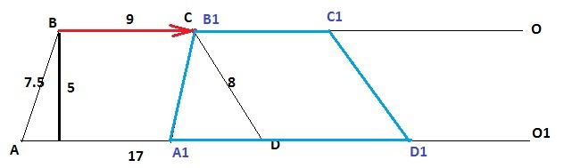 ABCD – данная трапеция, BC и АD её основания. Построить четырёхугольник, в который Отобразится данная трапеция при параллельном переносе на вектор BC. Указать, какой четырёхугольник получится и найти его площадь, если AB = 7,5 дм, CD = 8 дм, ВС = 9 дм, AD = 17 дм, а расстояние между основаниями равно 5 дм.