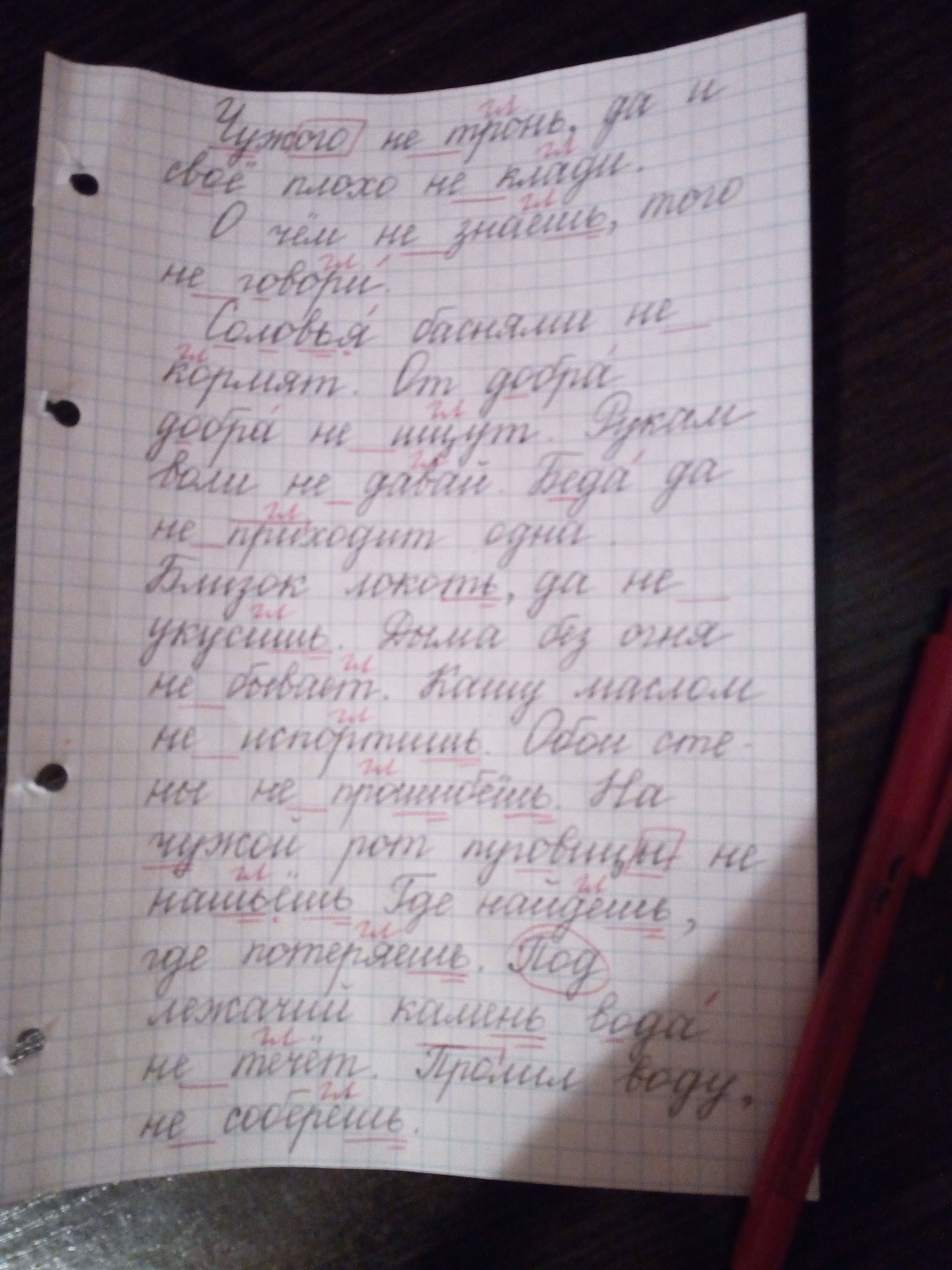 Чужого (не)тронь , да и своё плохо (не)клади. О чём (не)знаешь, того (не)говори. Соловья басними (не)кормят. От добра (не)ищут. Рукам воли (не)давай. Беда да (не)проходит одна. Близок локоть, да (не)укусишь. Дыма без огня (не)бывает. Кашу маслом (не)испортишь. Обои стены (не)прошибёшь. На чужой рот пуговицы (не)нашьёшь, где найдёшь, где (по)теряешь. (Под)лежачий камень вода (не)течёт. (Про)лил воду (не)соберёшь.