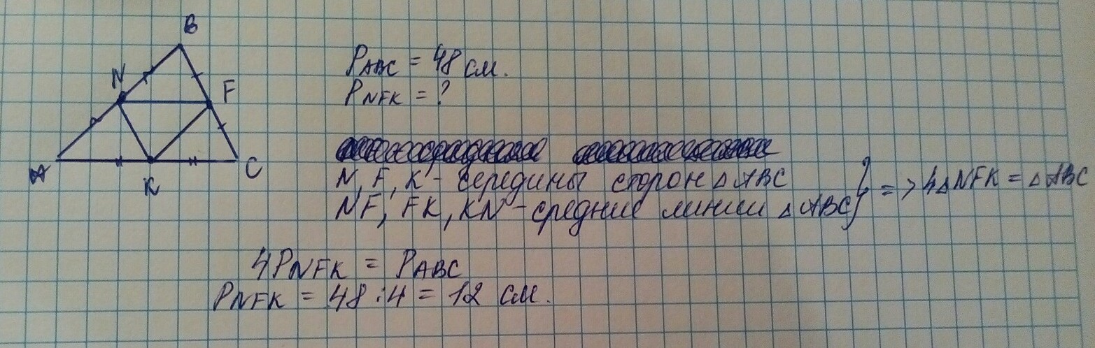 Точки N ; F ; K - середины сторон AB, BC и AC △ABC. Периметр △ABC = 48 см. Чему равен периметр △NFK?