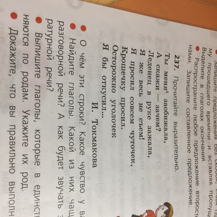 Глаголы: заобижала, скажи, зажала, съем, просил, просил, откусил.