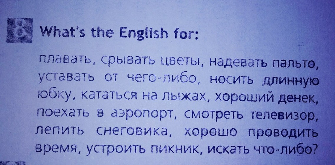 to swim, to pluck the flowers, to wear a coat, to tired of smth, to wear a long skirt, to ski, a good day,to go to the airport, to watch TV, to make a snowman, to have a good time, to set a picnic, to look for smth