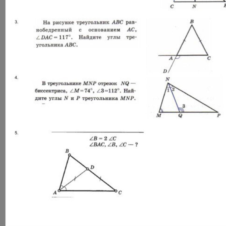 5. ∆АDС - р/б, значит Угол DAC=Угол DCA. Угол В=2*Угол С, значит Угол В=2*Угол ВАD. Угол А=2*Угол ВAD, значит Угол В=угол A. Из этого следует, что ∆АВС р/б. Угол С равен ½Угол В. Угол С равен 180-2*Угол В. Угол В - х. ½х=180-2х. 2½х=180. х=74° Угол С=74:2=37°