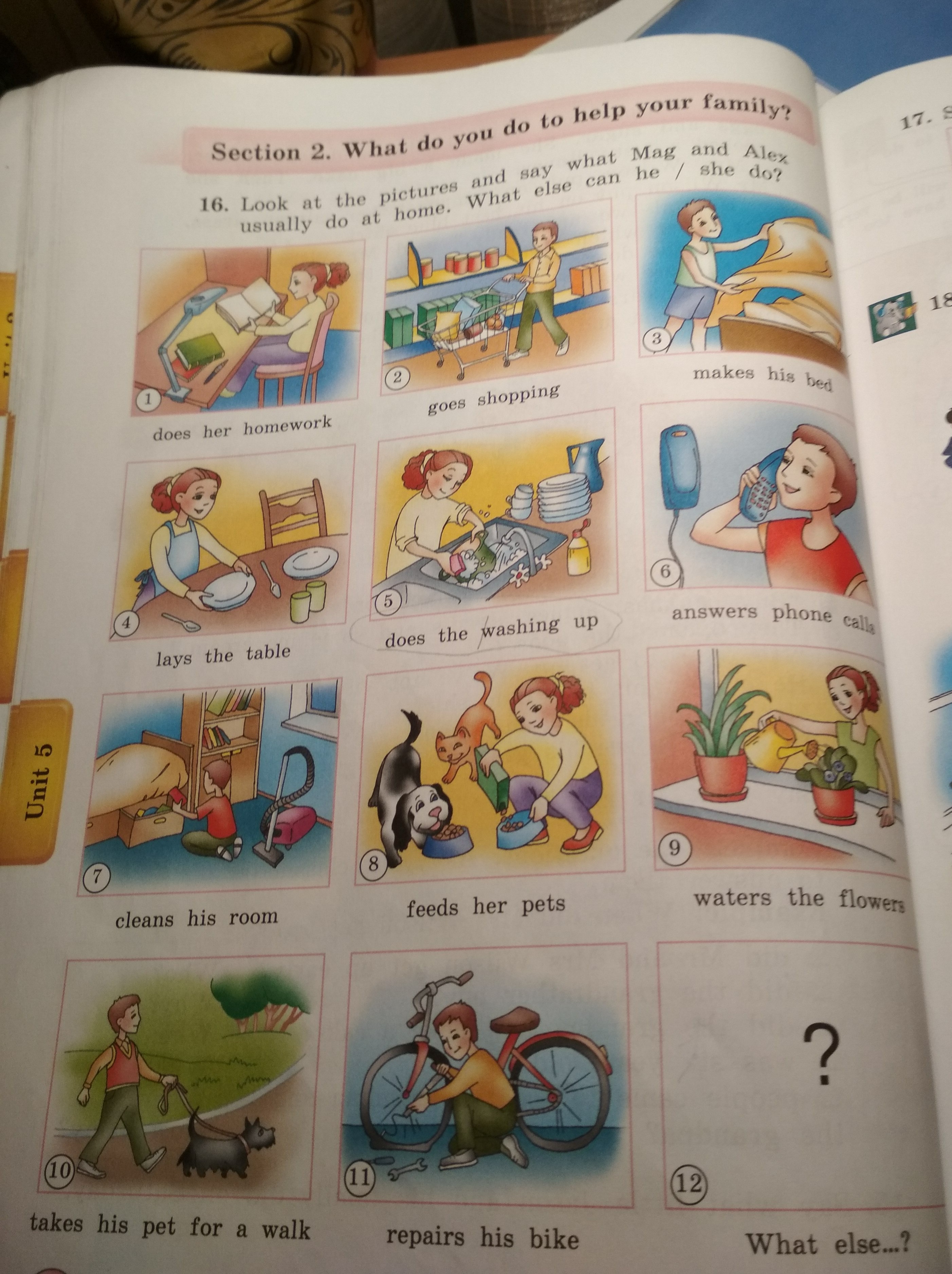 She does her homework. He goes shopping. He makes his bed. She lays the table. She does the washing up… и т.д. Ещё: She helps her mom. He goes to school.