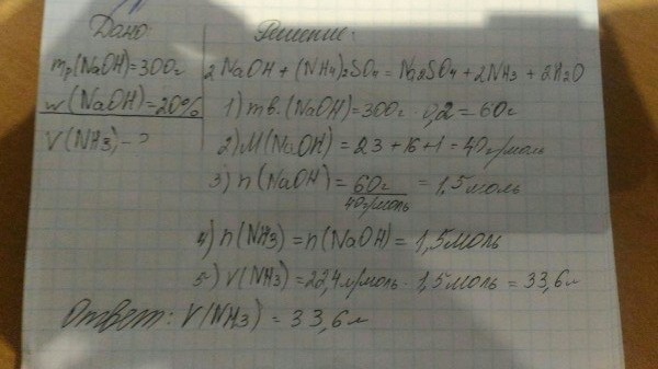 Вычислите объем аммеака (н.у) который образуется при взаимодействии 300г 20% раствора натрия гидроксида с аммоний сульфатом