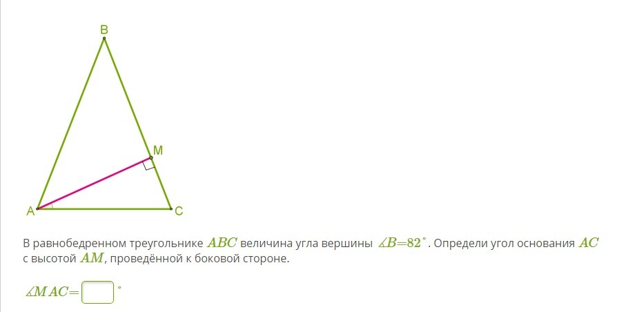 Т.к. ∠В=82 градуса, а треугольник равнобедренный, то ∠А=∠С=(180-82)/2=98/2=49 градусов.