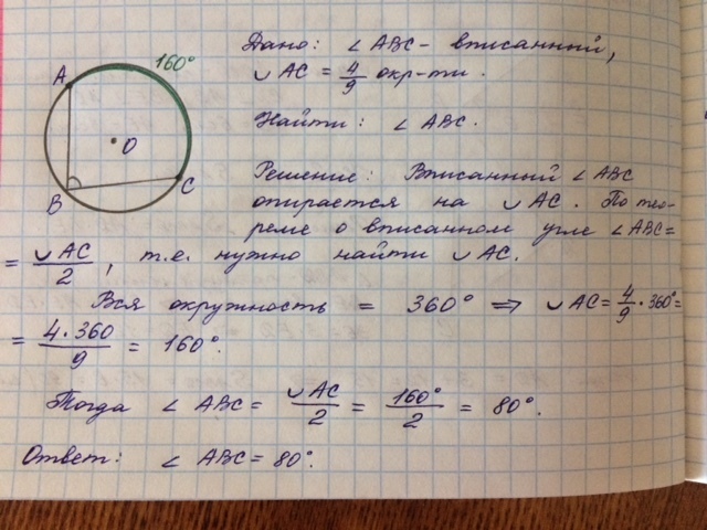 Найдите вписанный угол, опирающийся на дугу, которая составляет 4\9 окружности. По рисунку пожалуйста. Даю 25 баллов