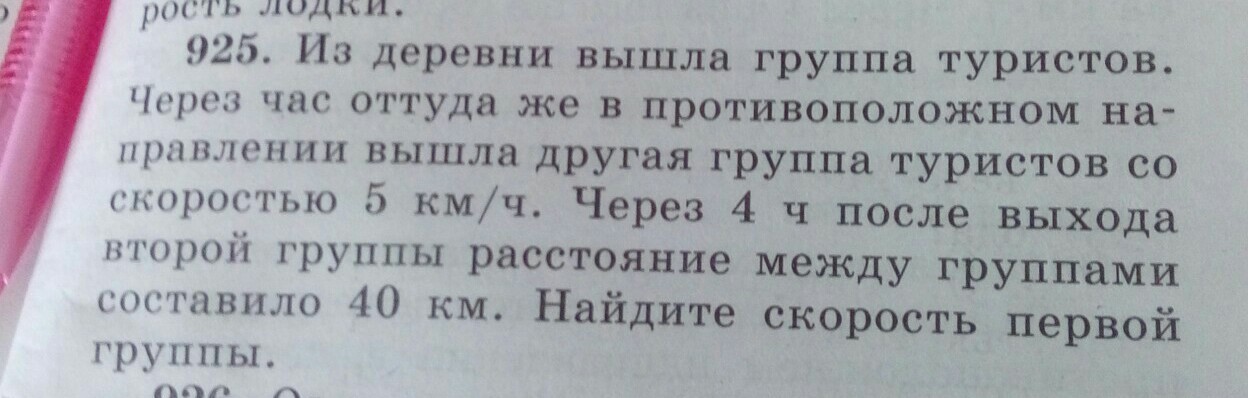 Вторая группа за 4 часа прошла 20 км, значит первая за 5 часов 40–20=20. Тогда их скорость 20/5=4 км/ч
