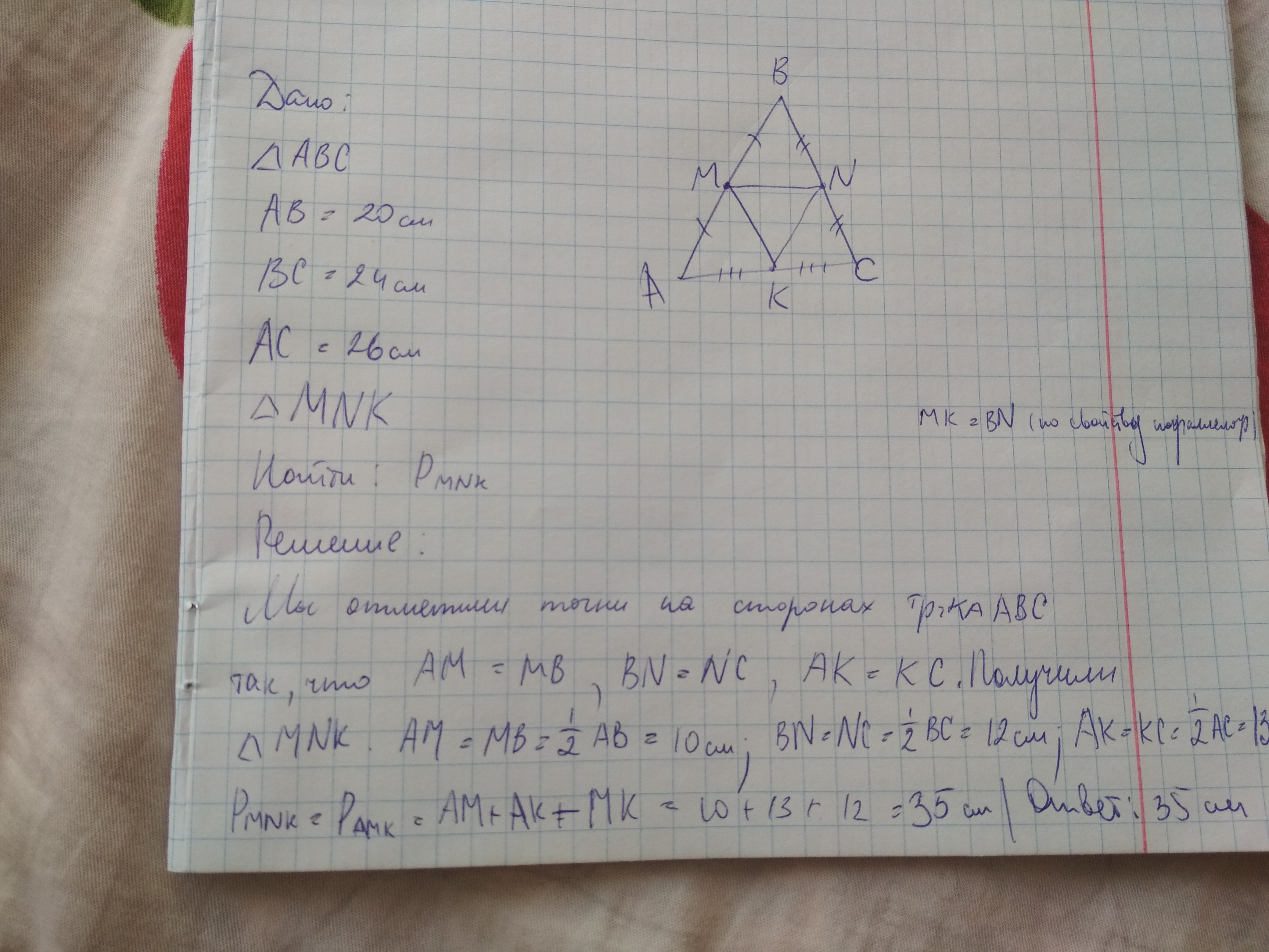Дан треугольник стороны которого равны 20,24,26 найти периметр треугольника,вершинами которого являются середины сторон