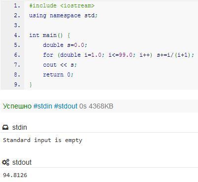 for (double i=1.0; i<=99.0; i++) s+=i/(i+1);