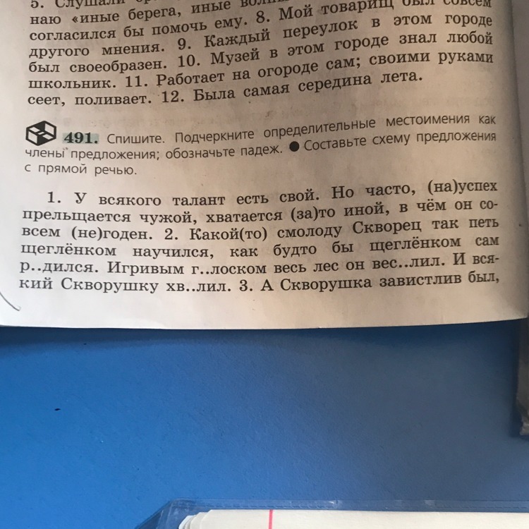 1. У всякого (род. п.) талант есть .свой. Но часто, на успех прельщается чужой, хватается за то иной (предл. п.), в чём он совсем не годен. 2. Какой-то смолоду Скворец так петь щеглёнком научился, как будто бы щеглёнком сам (им. п.) родился. Игривым голоском .весь (вин. п.) лес он веселил. И всякий (им. п.) Скворушку хвалил. 3. А Скворушка завистлив был, к несчастью, и думает: «Постойте же, друзья, спою не хуже я и соловьиным ладом». И подлинно запел, да только лишь совсем особым складом. 4. И, словом, разогнал всех (вин. п.) птиц своим пеньём.