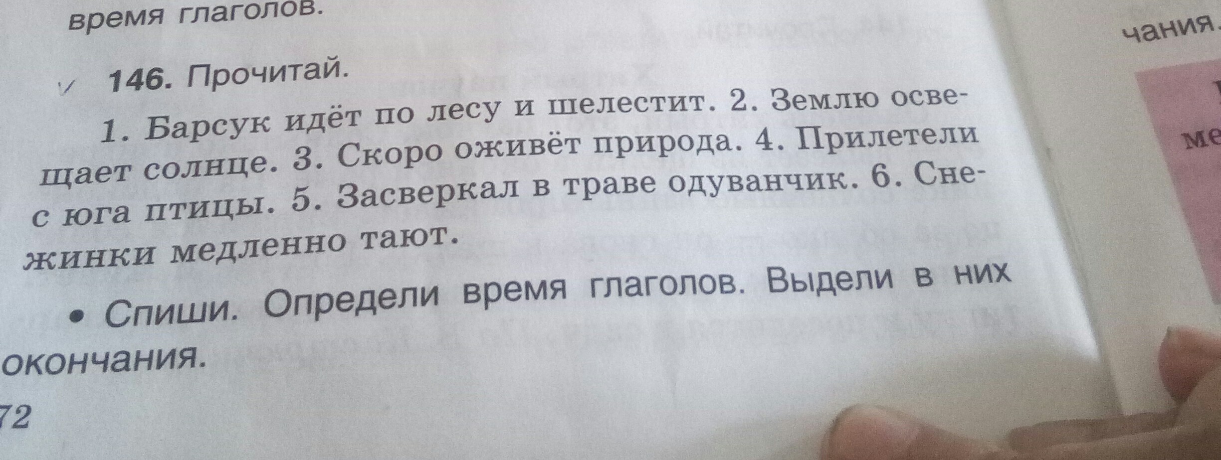 1.Барсук идёт(наст.вр.[ёт] ) по лесу и шелестит(наст.вр.[ит]) . 2. Землю освещает (наст.вр.[ет]) солнце . 3.Скоро оживёт(будущ,.время.[ёт]) 4.Прилетели( прош.вр.[и])с юга птицы .5 .Засверкал (нами.вр.[нулевое]) в траве одуванчик .6.Снежинки медленно тают(наст.вр[ют])