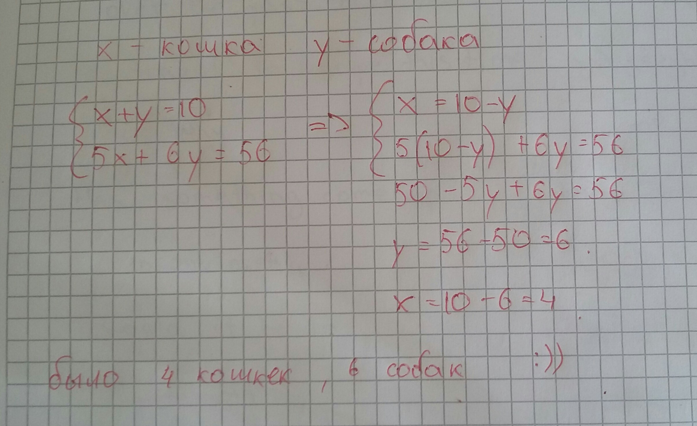 Помогите решить задачу: " Было 10 кошек и собак(вместе). Им раздали 56 косточек : по 5 каждой кошке и по 6 каждой собаке. Сколько было кошек и сколько собак?" Спасибо!