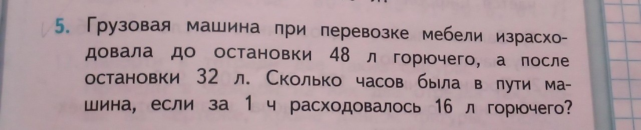 Всего было израсходовано 48+32=80 литров топлива. Теперь делим 80 на 16 литров. Получаем 5 часов езды.