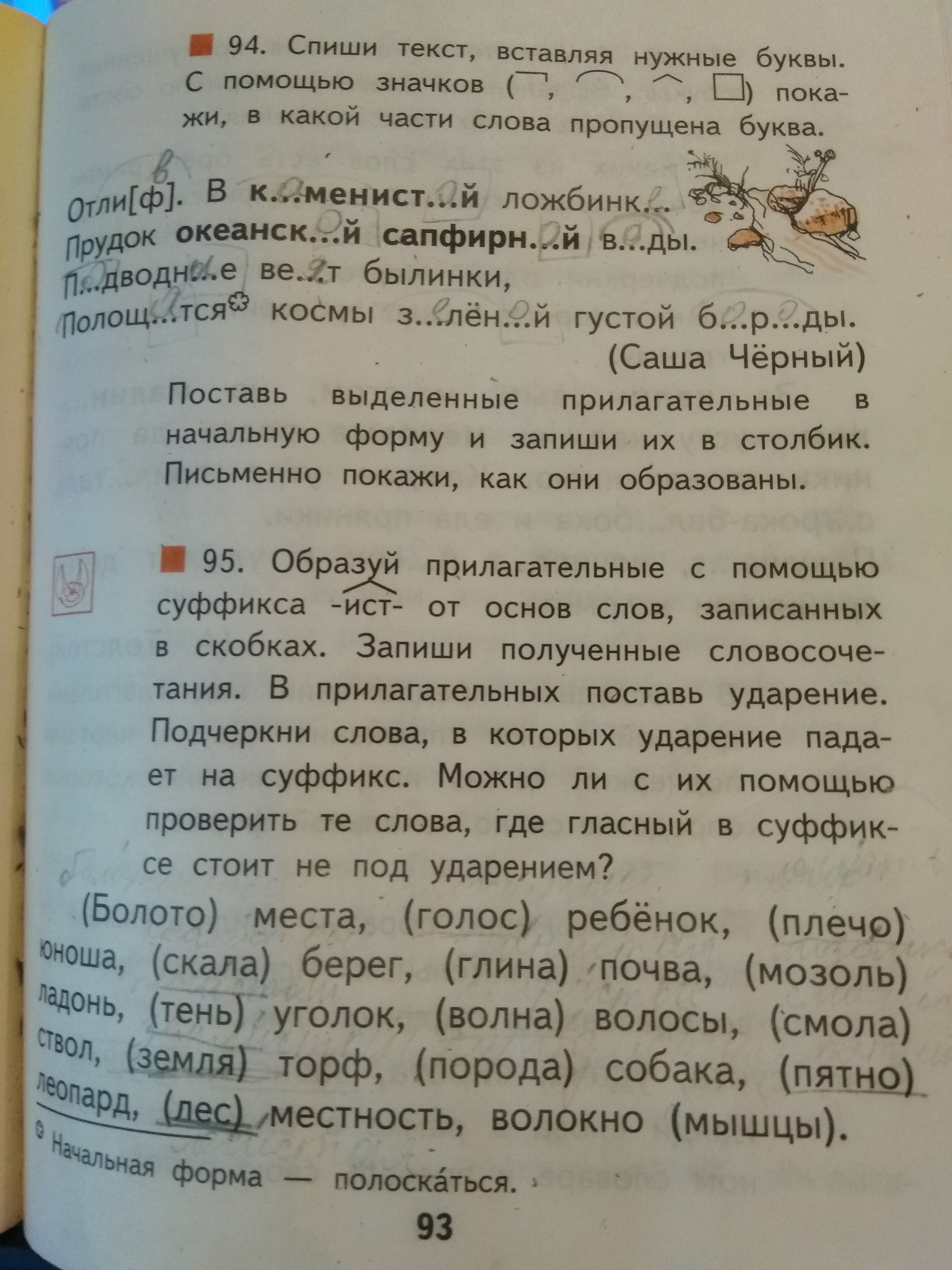 Болотистые места,голосистый ребёнок,плечистый юноша,скалистый берег,глинистая почва,мозолистая ладонь,тенистый уголок,волнистые волосы, смолистый ствол,землистый торф,породистая собака, пятнистый леопард,лесистая местность,волокнистые мышцы.