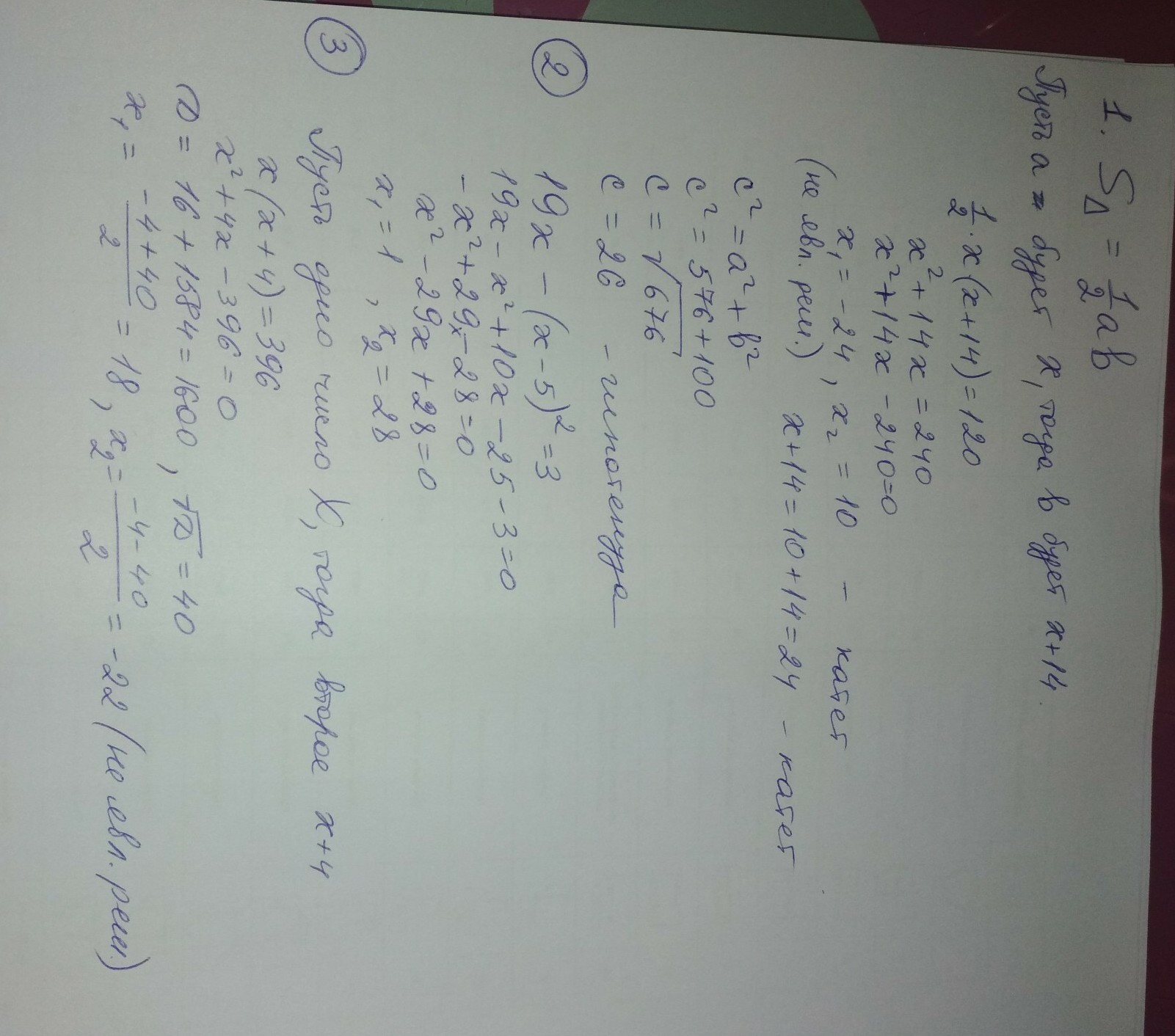 1.у прямоугольного треугольника площадь которого равна 120 см^2 один катет короче другого на 14см.Чему равна гипотенуза этого треугольника?