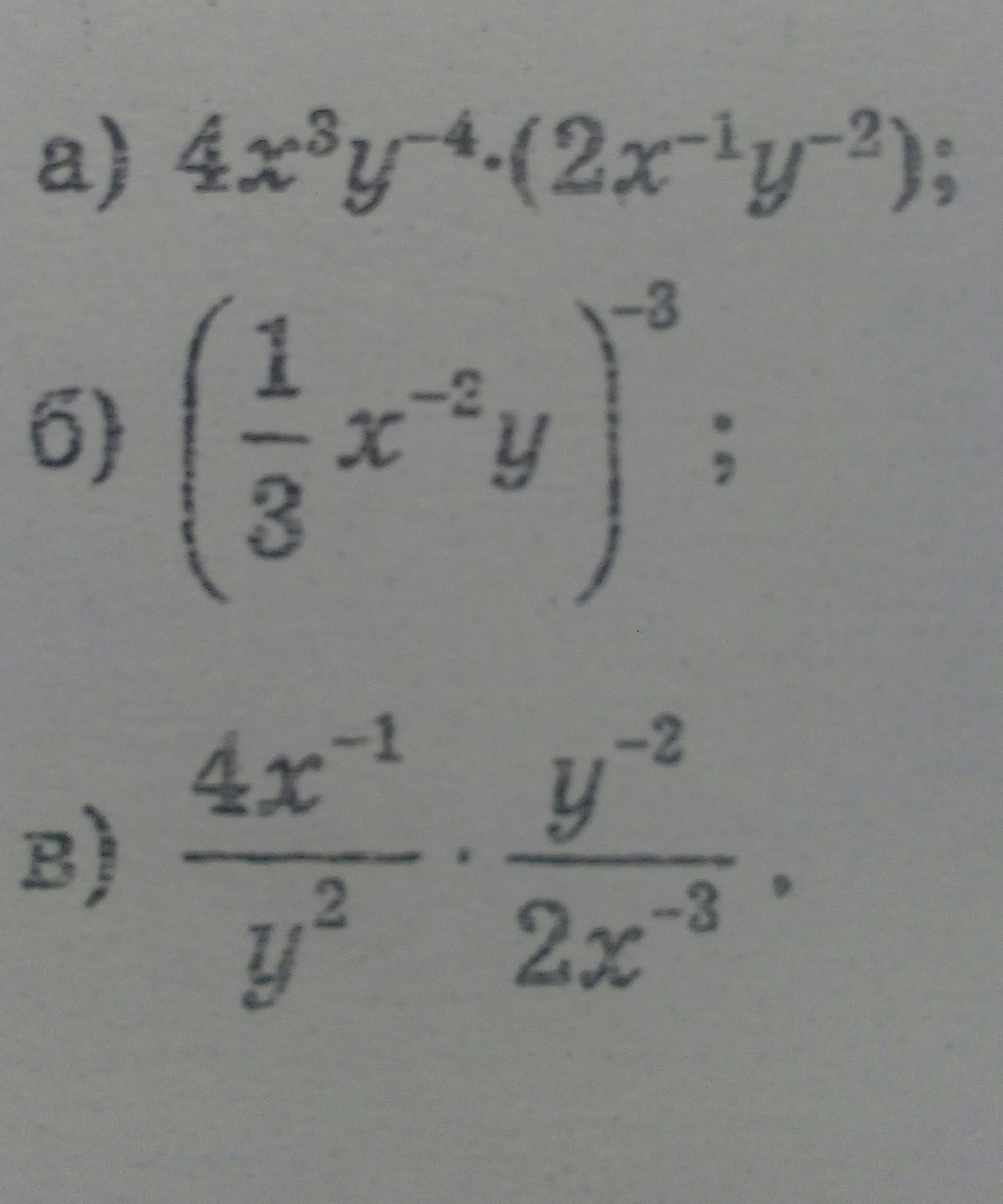 а) 4 x^3 y^-4 * (2 x^-1 y^-2)=8 x^2 y^-6