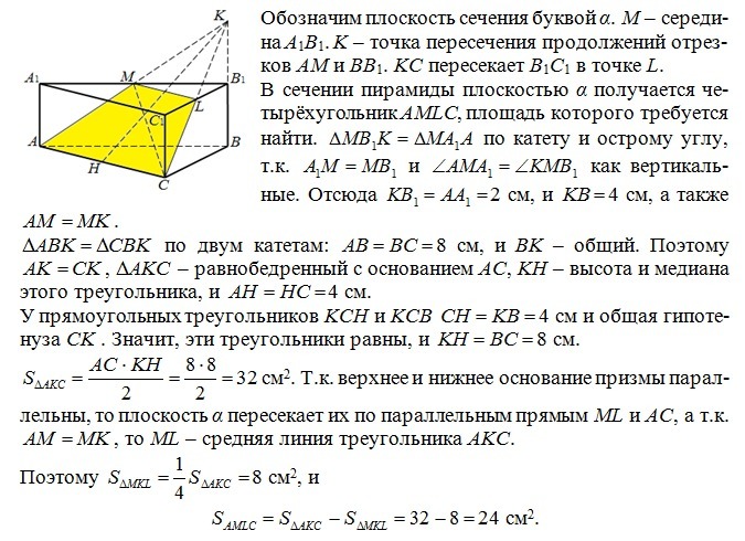 у правильній трикутній призмі АВС А1В1С1 сторона основи дорівнює 8 см а бічне ребро 2 см. через сторону АС нижньої основи і середину сторони А1В1 верхньої проведено площину. знайдіть площу утвореного перерізу призми .