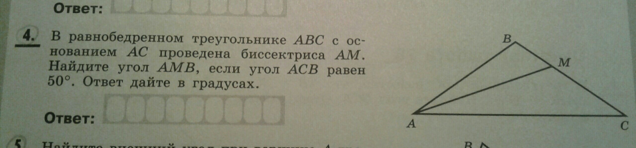 В равнобедреном треугольнике ABC с основанием AC проведена биссектриса AM. Найдите угол AMB, если угол ACB равен 50 градусов.