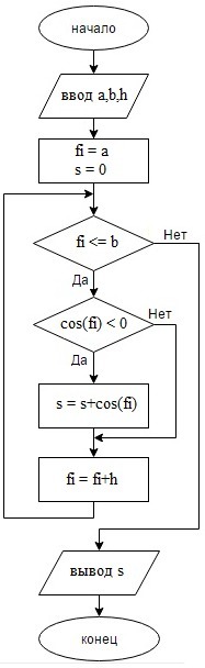 Вычислить сумму отрицательных значений Cos(fi) на интервале [а, b] с заданным шагом.