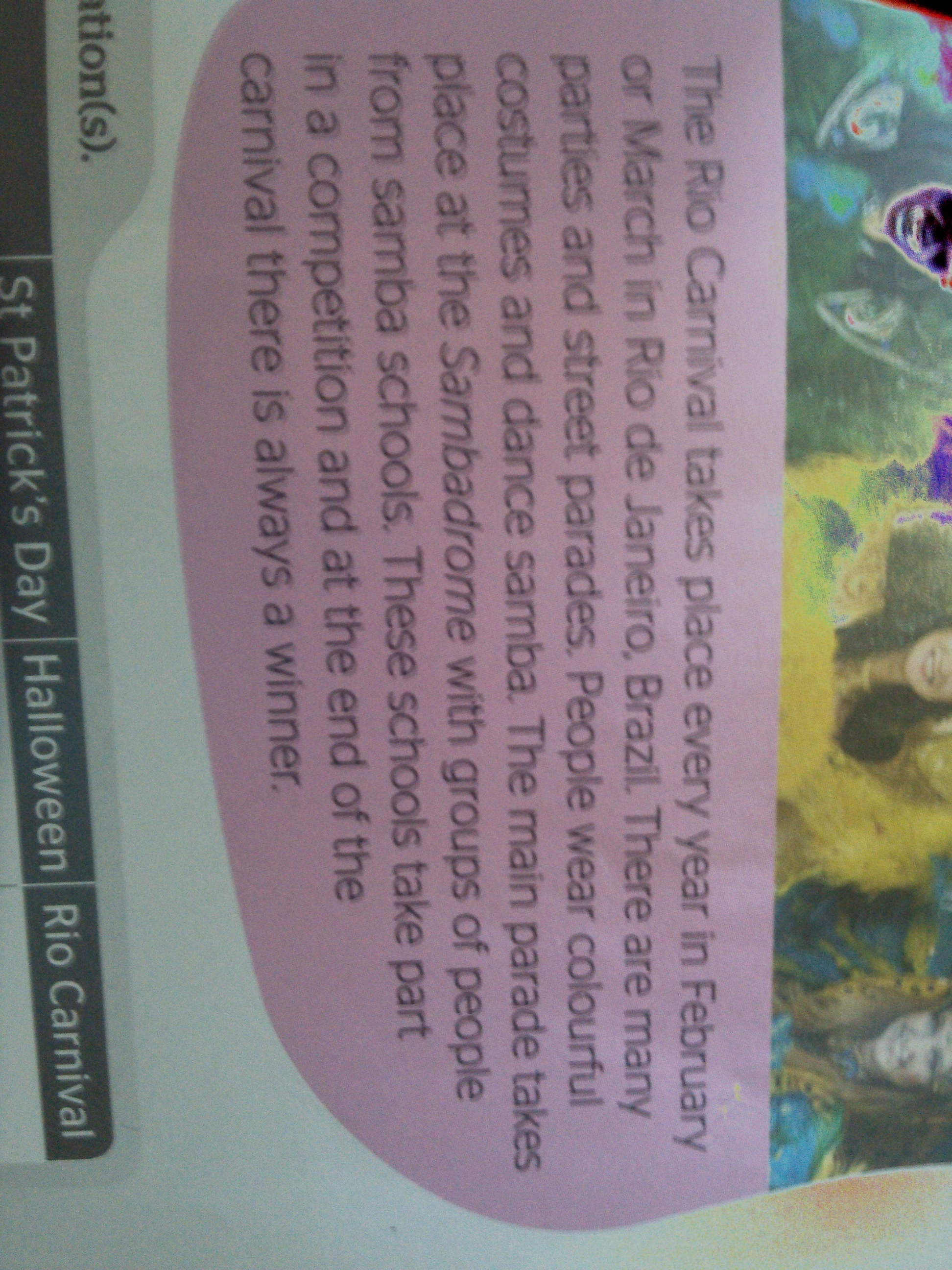 Карнавал рио проходит каждый год в Феврале или Марте в Рио Де Жанейро и Бразилии. Там проводится очень много вечеринок и уличных парадов. Люди одеты в очень яркие костюмы и танцуют самбу. Большинство парадов проходят в Самбодроме с группами учеников из школ по обучению самбе. Эти школы принимают участия в конкурсе и в конце празднования (карнавала) они всегда выигрывают.