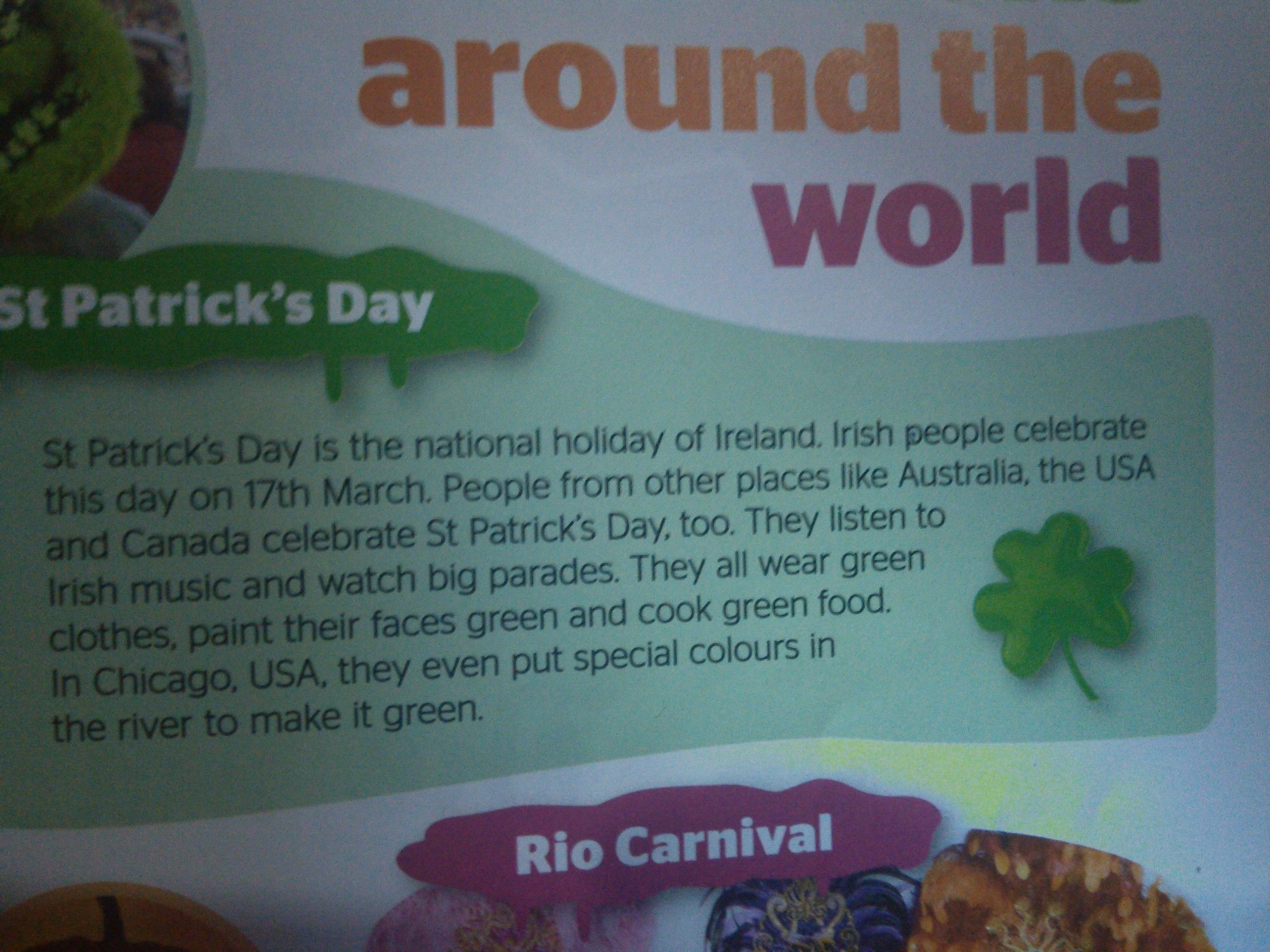 День Святого Патрика национальный праздник в Ирландии. Ирландцы празднуют его 17-ого Марта. Люди из других стран например Австралии, Америки и Канады так же празднуют его. Они слушают Ирландскую музыку и наблюдают большие парады. Они одеваются во все зеленое, разрисовывают себе лица зеленой краской и даже готовят зеленые блюда. В Чикаго и США они даже используют специальную краску что бы сделать воду в реках зеленой.