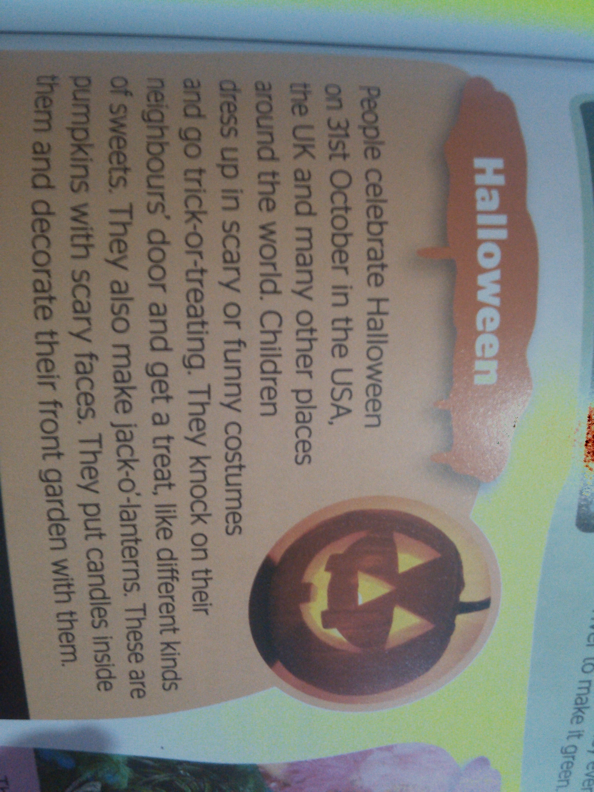 Люди празднуют Хэллоуин 31-ого Октября в США, Великобритании и многих других местах по всему миру. Дети одеваются в страшные или смешные костюмы и идут праздновать. Они звонят в дома соседей и получают вознаграждение в виде сладостей за проделаные старания. Так же они делают "Фонарей Джека". Это тыквы со страшными лицами. Люди вставляют в них зажженные свечи и выставляют их в саду.