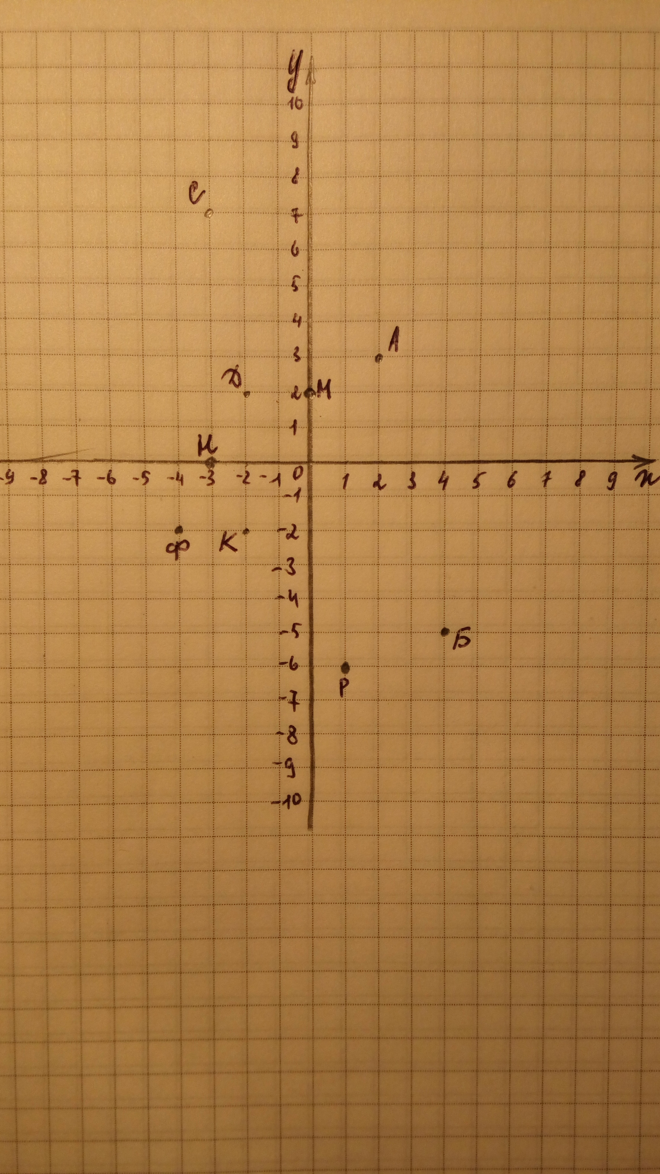 на координатной плоскости отметьте точки а(2 3) б (4, -5) с(-3, 7) д(-2, 2) к( -2, -2) м( 0, 2) н( -3, 0) р( 1, -6 ) ф ( -4, -2)