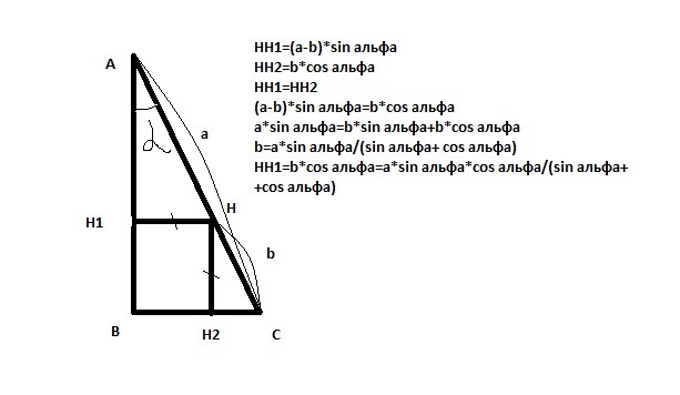 Теперь надо выразить это НН1 через а и ∠α. Н делит гипотенузу на две части b и a-b, выражу b через а...-второй рисунок