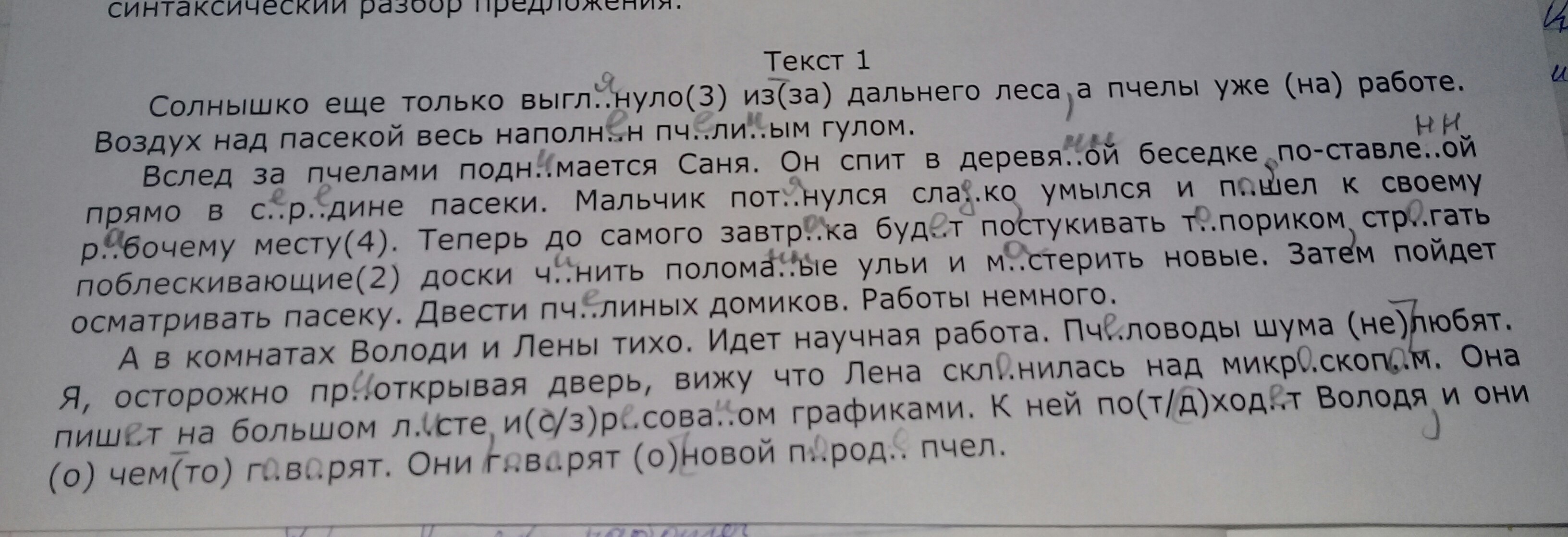 Солнышко ещё только выглЯнуло из-за дальнего леса, а пчёлы уже на работе. Воздух над пасекой весь наполнЕн пчЕлиННым гулом. Вслед за пчёлами поднИмается Саня. Он спит в деревяННой беседке поставленной прямо в сЕрЕдине пасеки. Мальчик поДтЯнулся, сладко умылся и пОшёл к своему рАбочему месту. Теперь до самого завтрАка будЕт поДстукивать тОпориком, стрОгать поблескивающие доски, чИнить поломаНые ульи и мастерить новые. Затем, пойдёт осматривать пасеку. Двести пчЕлиных домиков. Работы немного. А в комнатах Володи и Лены тихо. Идёт научная работа. ПчЕловоды шума не любят. Я, осторожно приоткрываю дверь, вижу, что Лена склОнилась над микрОскопОм. Она пишЕт на большом лИсте иЗрИсоваННом графиками. К ней поДходит Володя и они о чём-то гОвОрят. Они гОвОрят о новой пОродЕ пчёл.