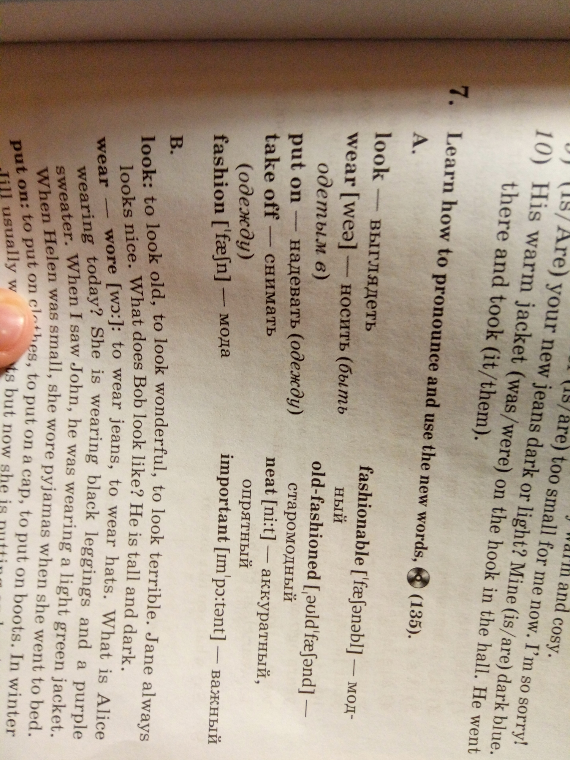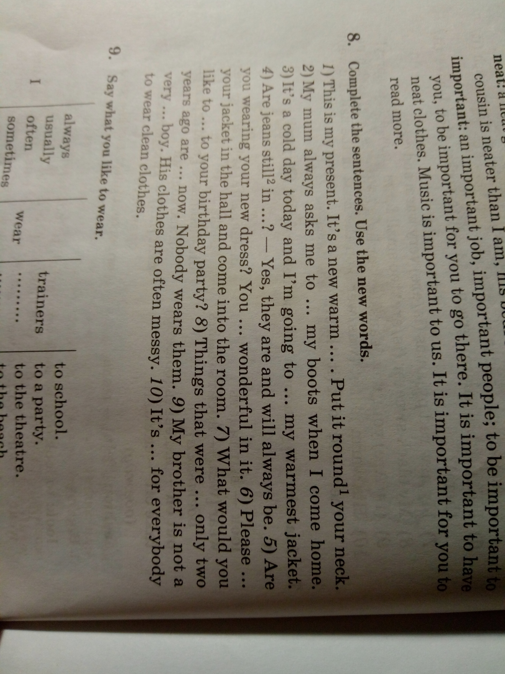 Put it round your neck.2)My mum always asks, me to ... my bots when I come home.3)It's a cold day today and I am going to ... my warmest jacket.4)Are jeans still in ... ? -Yes, they are and will always be.5)Are you wearing your new dress? You ... wonderful in it. 6)Please ... your jacket in the hall and come into the room. 7) What would you like to ... to your birthday party?
