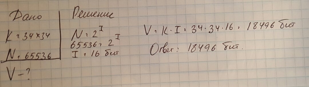Укажи минимальный объём памяти (в битах), достаточный для хранения любого растрового изображения размером 34×34 пикселя, если известно, что в изображении используется палитра из 65536 цветов. Саму палитру хранить не нужно.