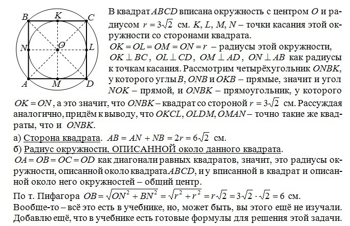 б) радиус окружности, ОПИСАННОЙ около данного квадрата