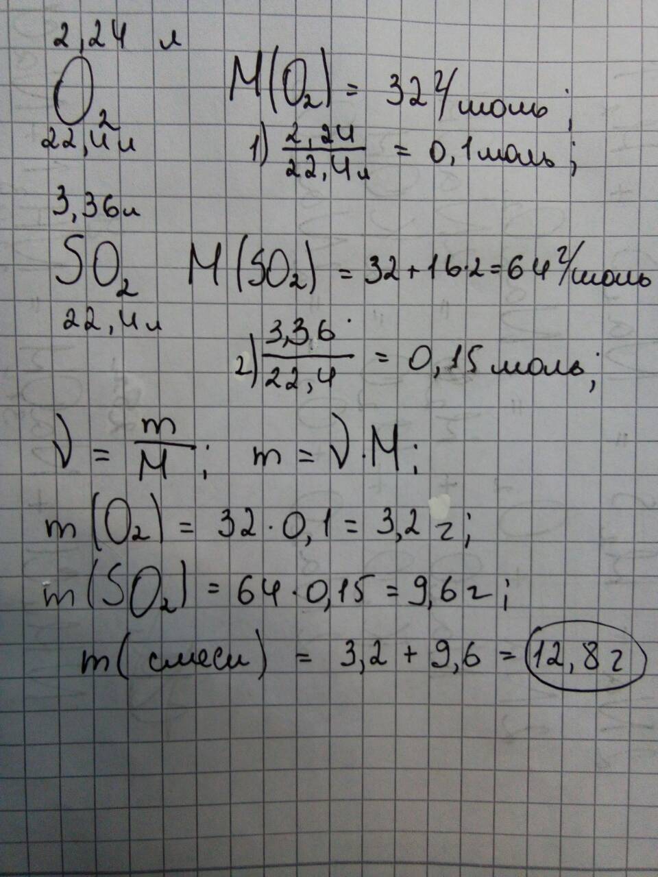 Газовая смесь содержит кислород объемом 2,24 л и оксид серы (IV) объемом 3,36 л. Объемы газов приведены к нормальным условиям. Определите массу смеси
