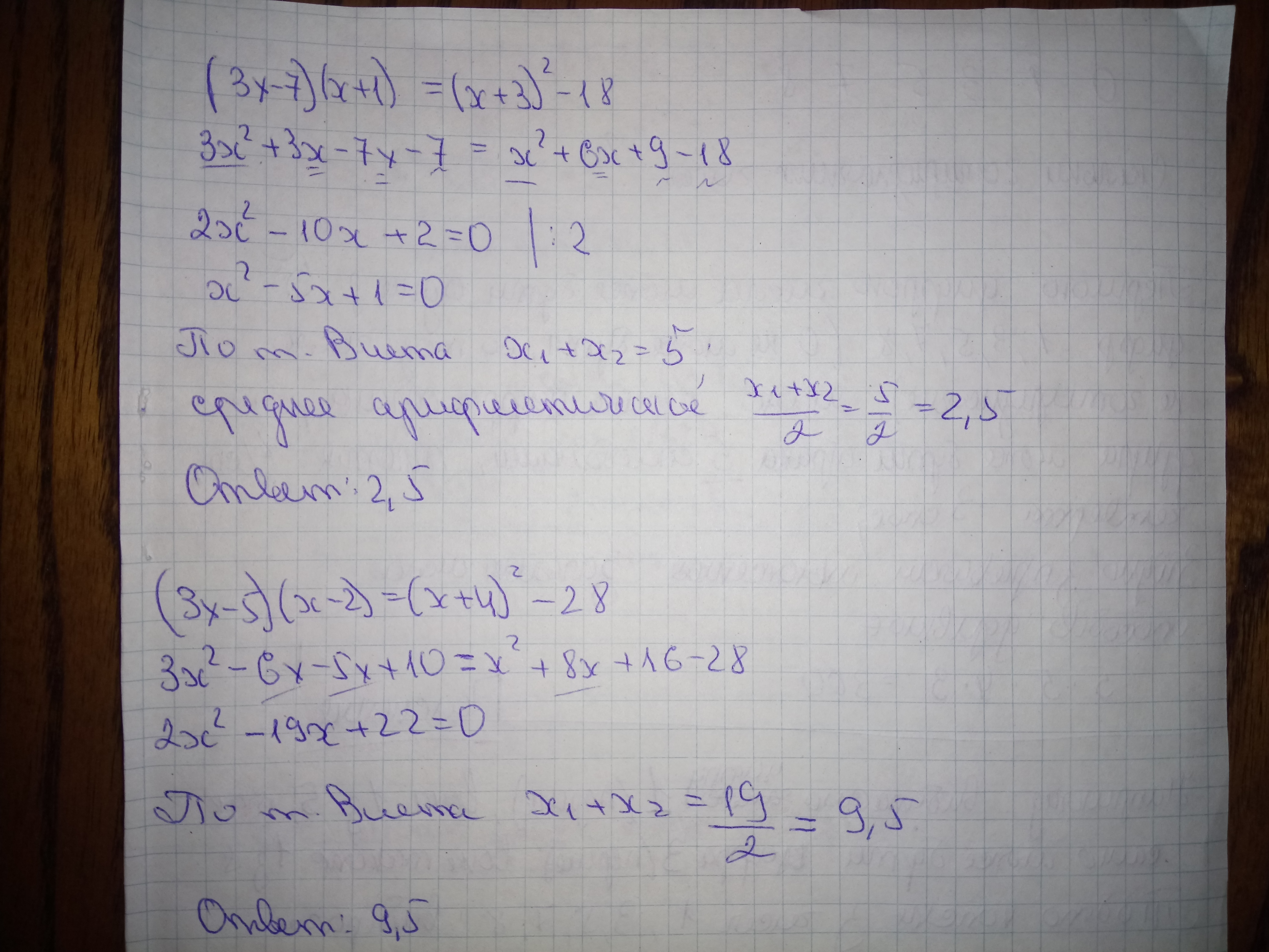 Ой...погоди секунду. Во втором просто сумма корней, по т. Виета она будет равна второму коэффициенту, взятому с другим знаком, т.е просто 19. Извини, если что, и, если ты не занят, направь, как надо, пожалуйста..?