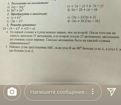 4. первая стоянка будет- х, тогда вторая стоянка- 4х, когда машины приехали на 1 стоянку стало- х+35, на второй когда уехали стало- 4х-25, делаем уравнение