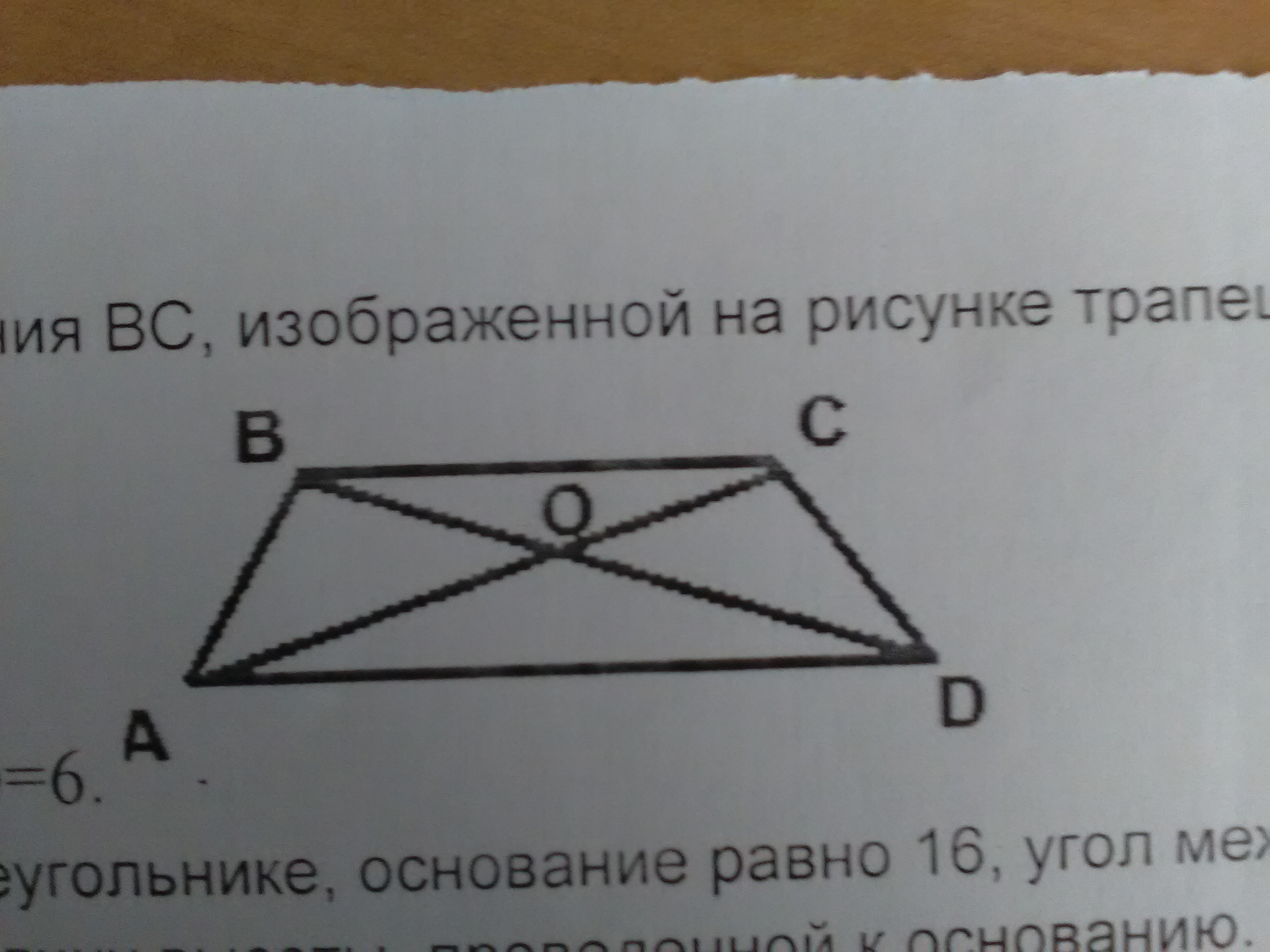 найдите длину основания BC изображенной на рисунке трапеции ABCD если Ad=15 Bo=2 OD= 6