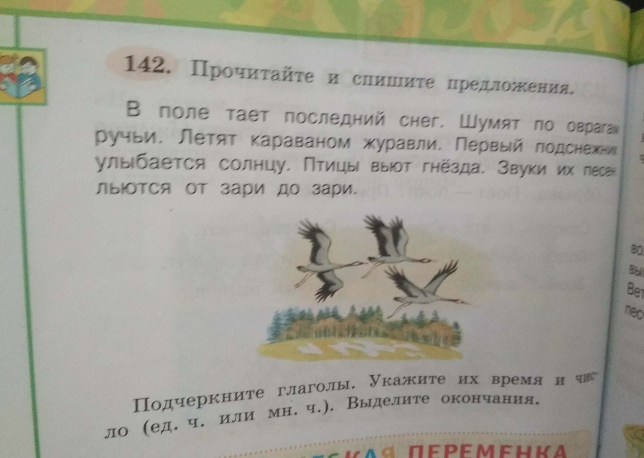 В поле та|ет| (наст.вр., ед.ч.) последний снег. Шум|ят| (наст.вр, мн.ч.) по оврагам ручьи. Лет|ят| (наст.вр., мн.ч.) караваном журавли. Первый подснежник улыба|ет|ся (наст.вр., ед.ч.) солнцу. Птицы вь|ют| (наст.вр., мн.ч.) гнёзда. Звуки их песен ль|ют|ся (наст.вр., мн.ч.) от зари до зари.