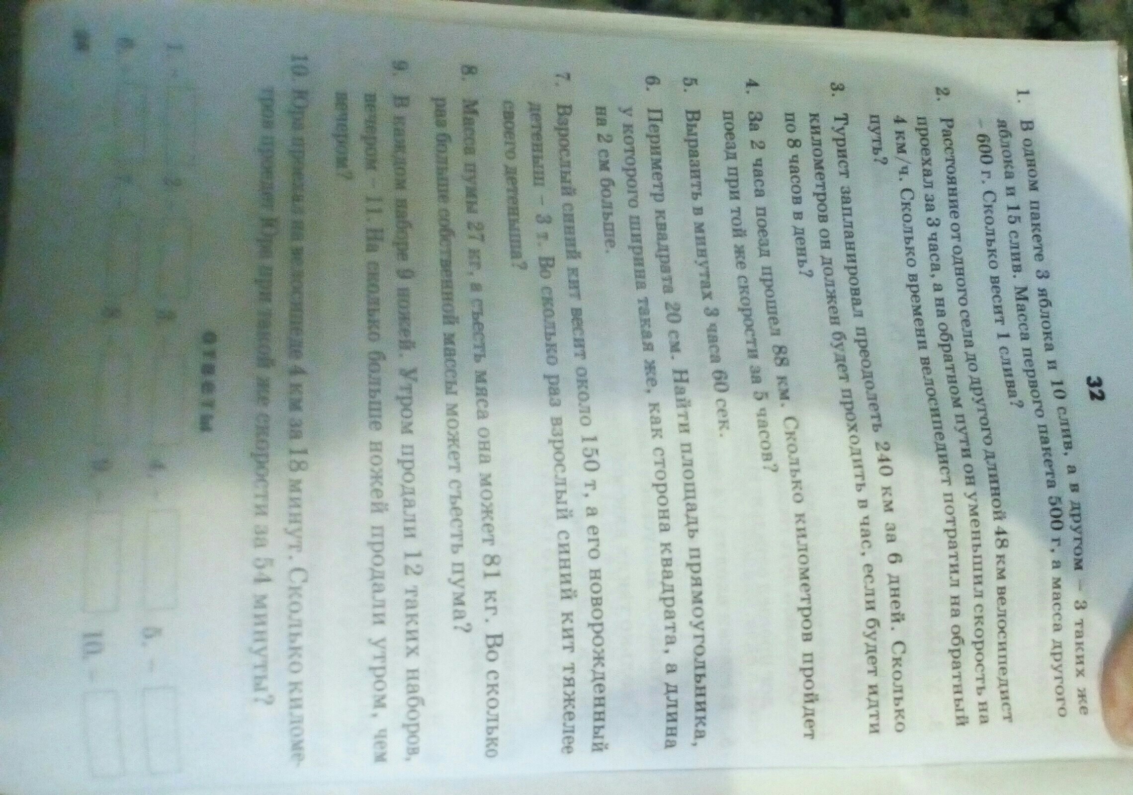 Держи 1. 20 грамм 2. за 4 часа 3. 5 км 4. 220 км 5. 181 мин 6. 35 см(в квадрате) 7.в 5 раз 8. в 3 раза 9. на 9 ножей 10. 12 км