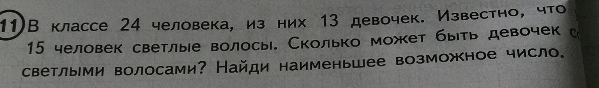 В классе мальчиков всего 24-13=11. То есть если у всех мальчиков будут светлые волосы, то 15-11=4 это наименьшее возможное число девочек со светлыми волосами. Если же количество мальчиков уменьшать, то число Девочек с такими волосами будет наоборот больше