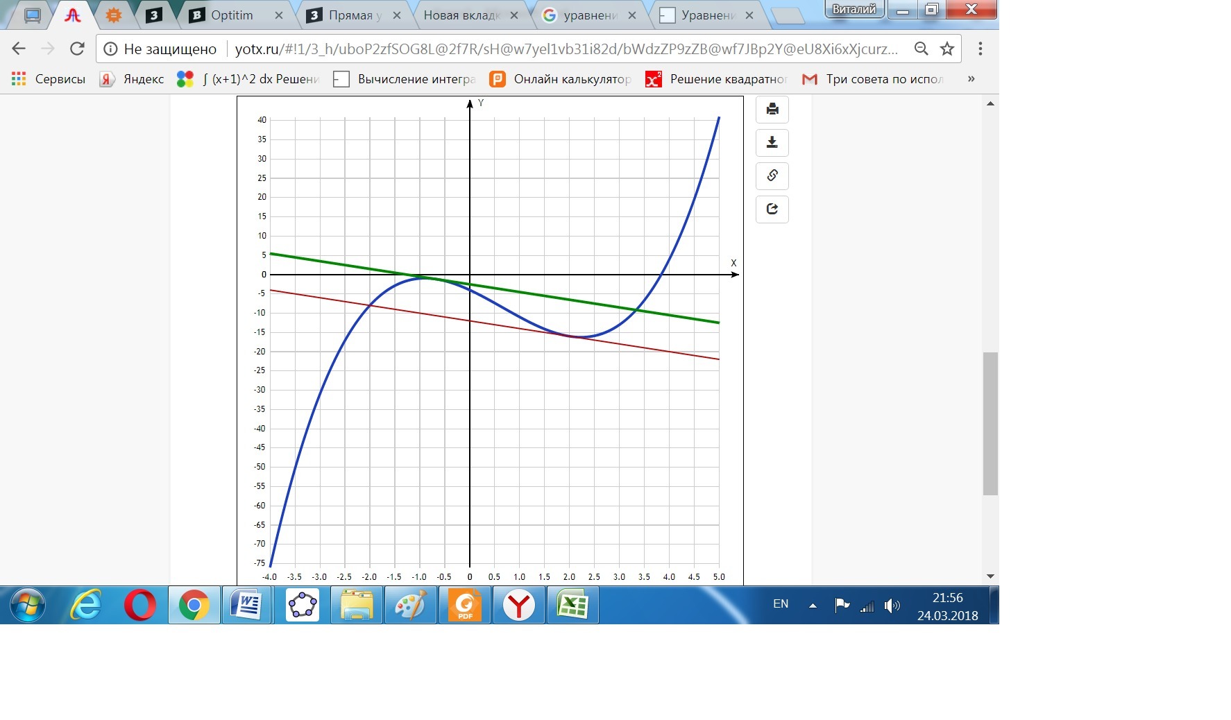 Используя уравнение касательной у(кас) = y'(xo)*(x-xo)+y(xo), находим уравнения для полученных двух точек.