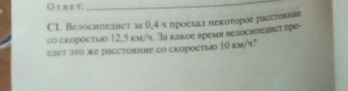 Помогите с решением . ( Велосипедист за 0.4 часа проехал некоторое расстояние со скоростью 12,5 км/ч . За какое время велосипедист проедет это расстояние со скоростью 10 км/ч ? )