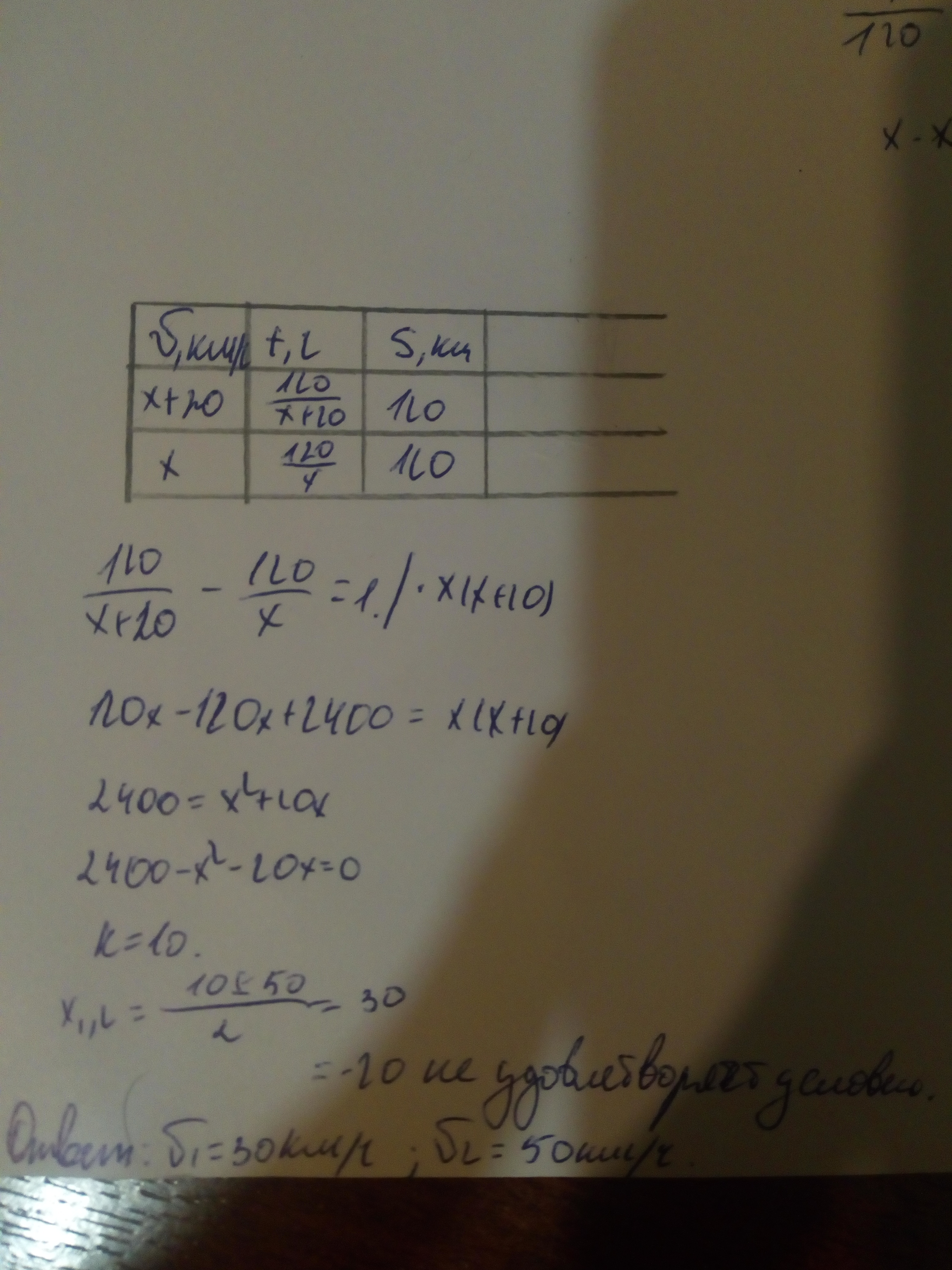 Из города в село, находящееся от него на расстоянии 120КМ, выехали одновременно два автомобиля. Скорость одного была на 20 км/ч больше скорости другого, и поэтому он пришел к месту назначения на 1ч раньше. Найдите скорость каждого автомобиля. помогите пожалуйста решить
