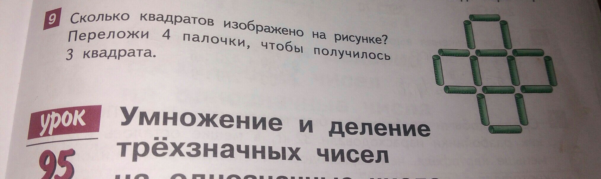 на рисунке изображено 5 квадратов, чтобы получилось 3 квадрата, переставь 4 палочки сверху вниз