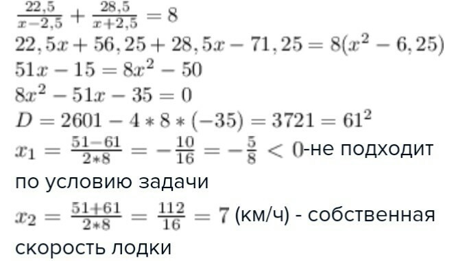 Лодка прошла против течения 22,5 км и по течению 28,5 км затративши на весь путь 8 часов. Найти собственную скорость лодки если скорость течения 2,5 км