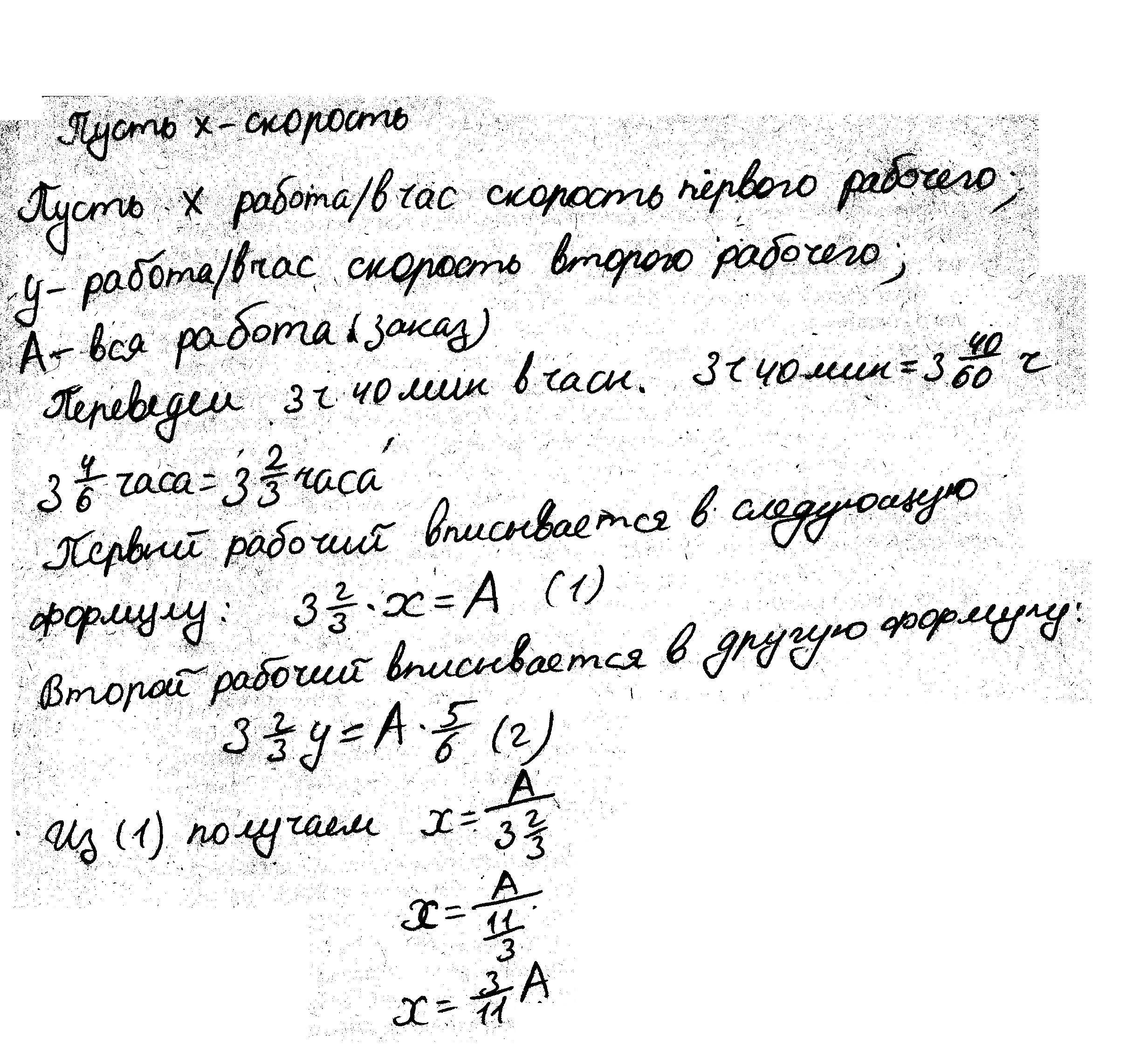 Один рабочий может выполнить заказ за 3ч.40мин.,а второй за это же время выполнит5/6заказа.За какое время они выполнят закаэ, если будут работать вместе?