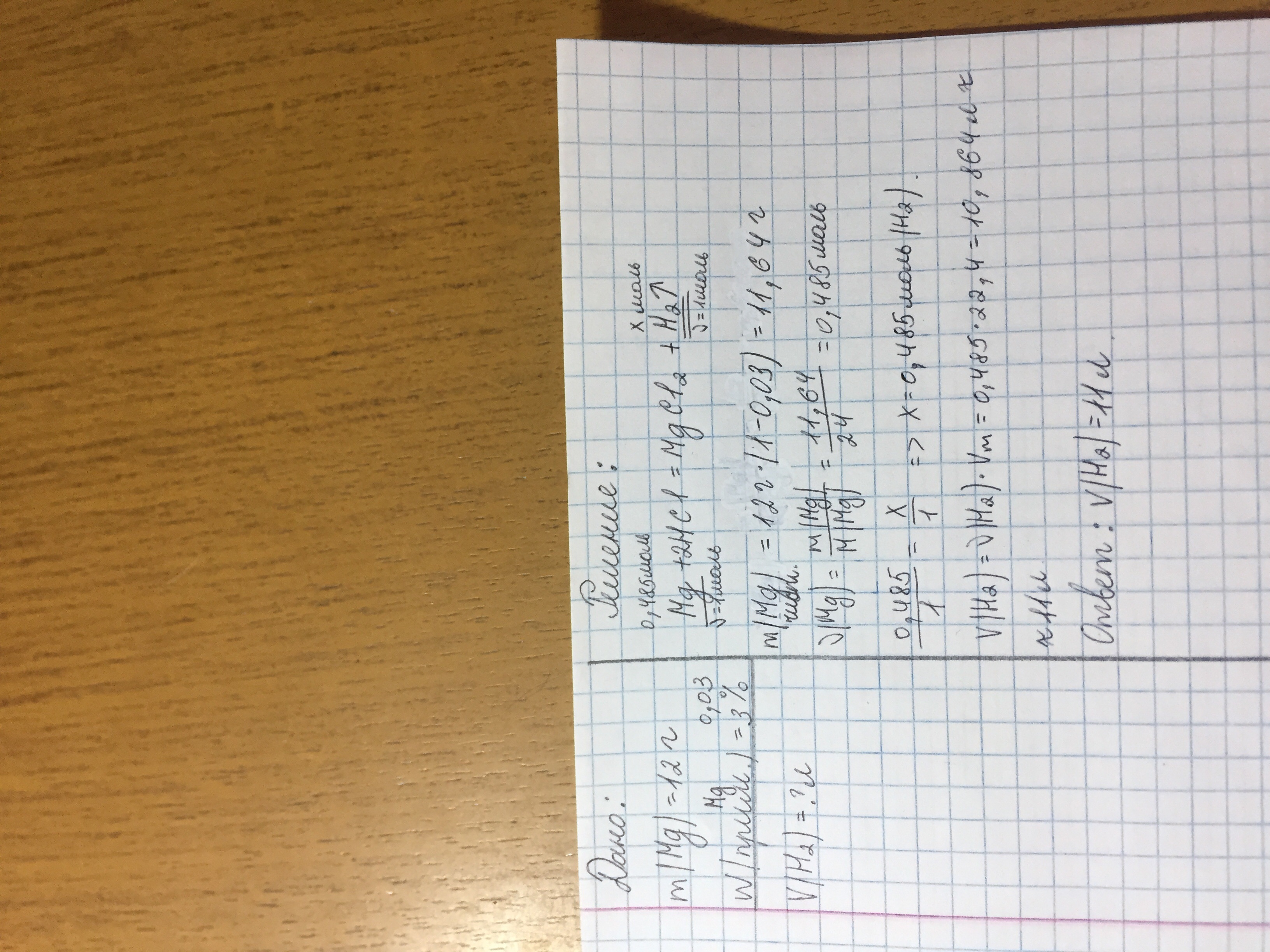 Какой объем водорода выделиться при взаимодействии 12г Магния содержащего 3% примеси с соляной кислотой